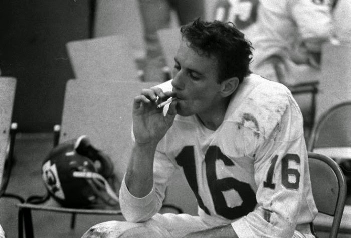 Halftime at Super Bowl I (Kansas City Chiefs’ Quarterback Len Dawson. He would later win Super Bowl IV in 1970 and be named MVP. Diagnosed with cancer in 1991 but still alive – he’s 78 now.)