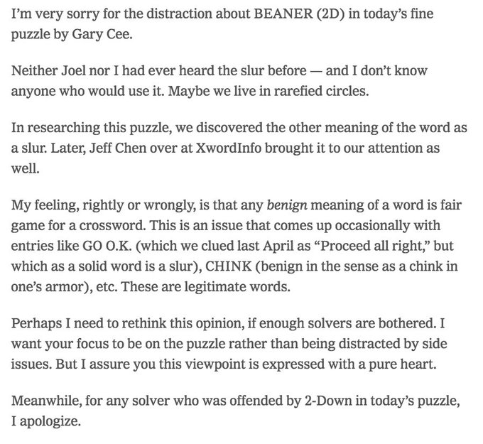 “My feeling, rightly or wrongly, is that any benign meaning of a word is fair game for a crossword puzzle,” Shortz wrote.